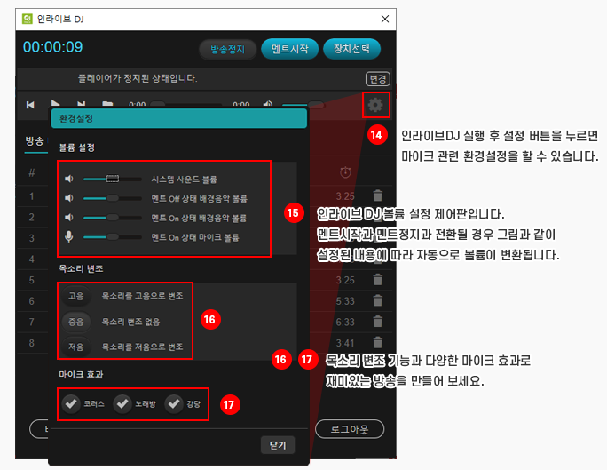 ⑭ 클릭해서 실제 DJ처럼 마이크를 사용하여 멘트를 하면 됩니다.
