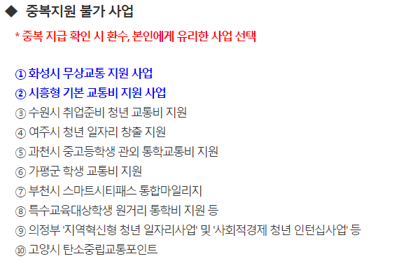 - 중앙부처 및 지방자치단체에서 시행하는 사업에서 명시적으로 교통비 지원받은 경우 중복지원 불가