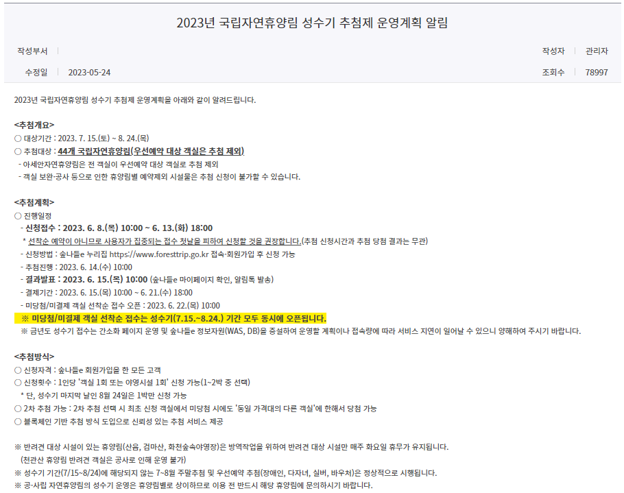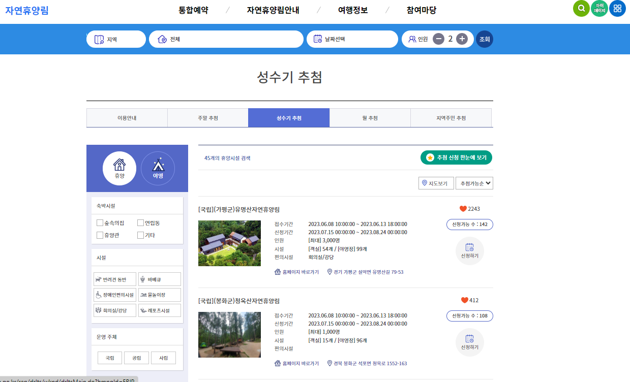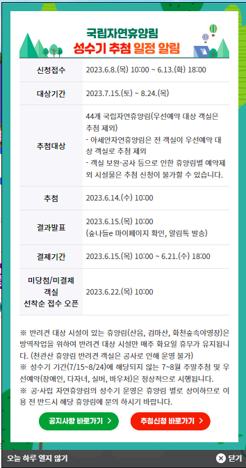 국립 자연휴양림 숲나들e 성수기 추첨 접수를 받고 있습니다.