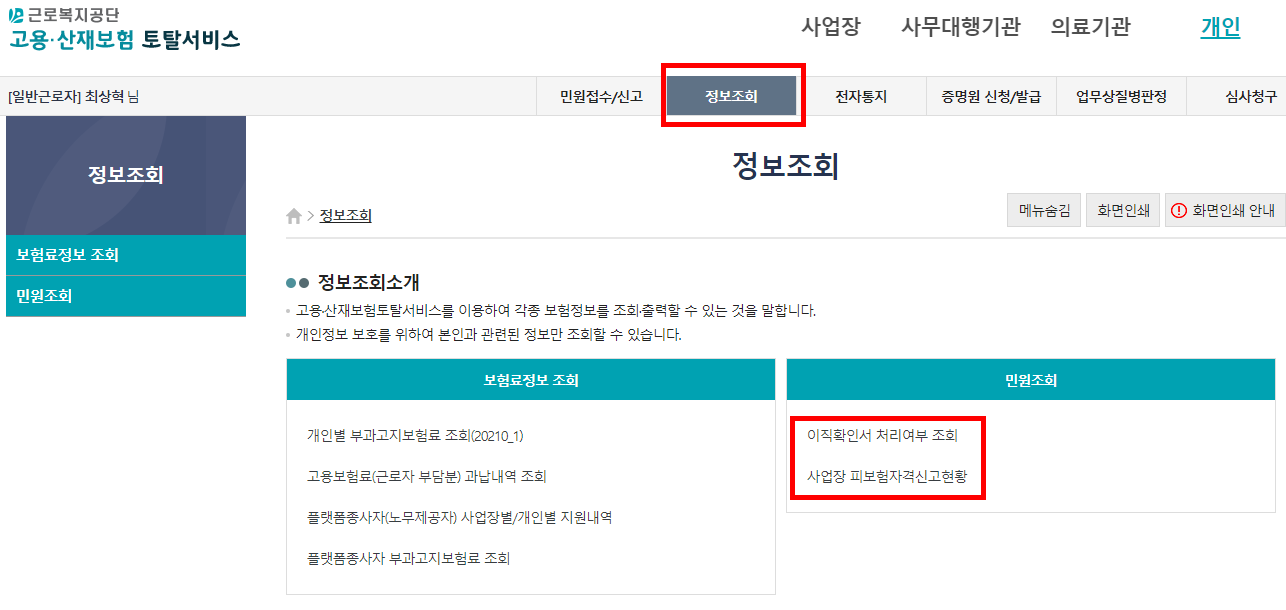 주민등록번호 입력하시고 인증하고 로그인하고 상단에 정보조회 클릭하여 아래 이직확인서 처리여부 조회와 사업장 피보험자격신고현황을 클릭하여 확인합니다.