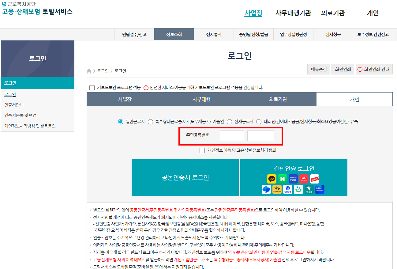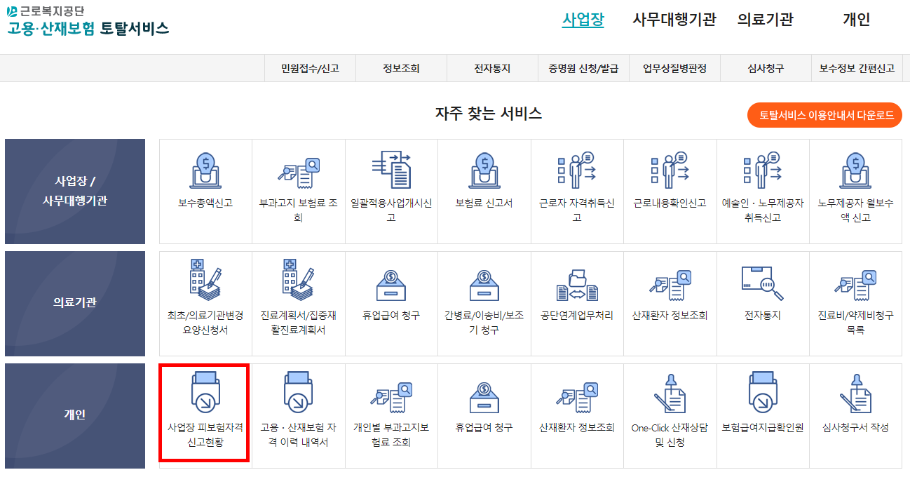 위 링크로 들어가서 개인에 사업장 피보험자격 신고현황을 클릭합니다.