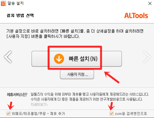6. 빠른 설치 밑에 위메프/하프클럽/쿠팡 제휴추가, zum을 검색엔진은 체크해제하시고 설치하세요.