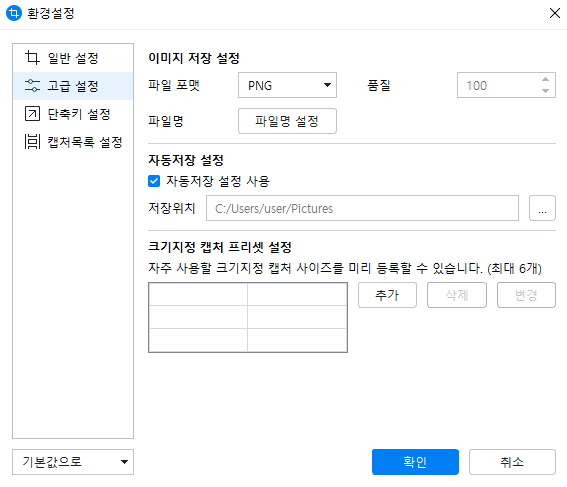 파일형식이나 이미지파일 품질, 파일명, 저장위치 등을 설정합니다.