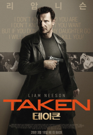 테이큰은 뤽 베송과 로버트 마크 케이맨이 감독한 피에르 모렐 감독의 2008년 액션 스릴러 영화입니다. 이 작품의 아이디어는 원래 그의 오랜 협력자인 로버트 마크 케이맨에서 뤽 베송에게 갔습니다. 케이맨은 인신매매로부터 딸을 구출해야 하는 아버지에 대한 영화를 구상했습니다. 뤽 베송은 그 아이디어에 금방 흥미를 느꼈고 영화 제작을 결정했습니다. 결국 뤽 베송과 케이맨은 각본을 함께 썼고, 케이맨은 액션영화 각본가로서의 경험을 살려 각본을 썼습니다. 이 영화는 2009년 1월 미국에서 개봉하여 전 세계적으로 2억 2600만 달러 이상의 수익을 올리며 흥행 수입으로 대박을 터뜨렸습니다. 러닝타임은 93분이며, 장르는 범죄, 액션, 스릴러입니다. 이 영화의 성공은 2012년 테이크 2와 2014년 테이크 3의 두 속편으로 이어지게 됩니다. rotten tomatoes에서는 신선도 59%, 관객점수 85%이며, 메타스코어는 100점 만점에 51점을 받았습니다.