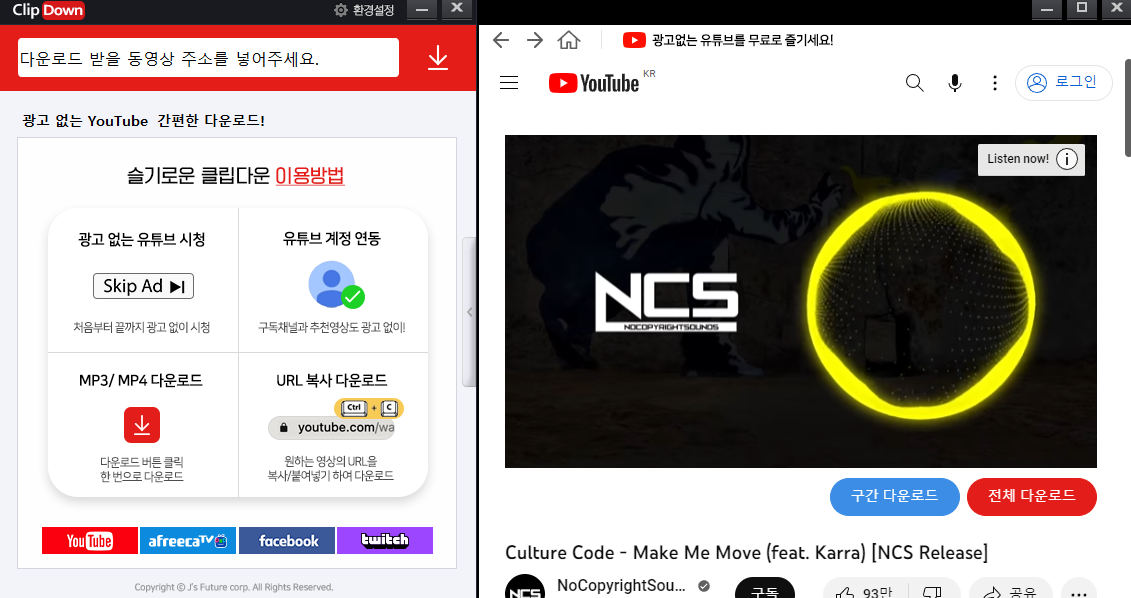 오른쪽 영상에서 구간이나, 전체 다운로드 중 원하는걸 클릭해서 다운받습니다.