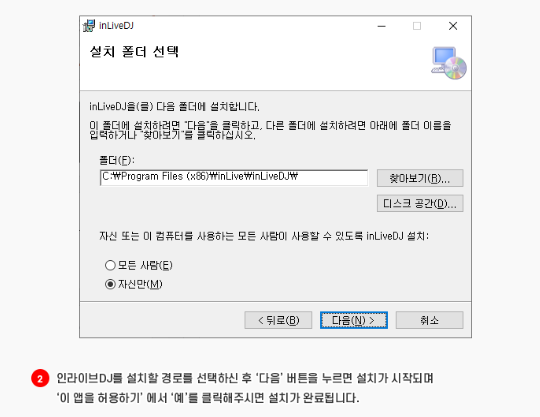 ② 인라이브DJ를 설치할 경로를 선택하신 후 '다음' 버튼을 누릅니다.