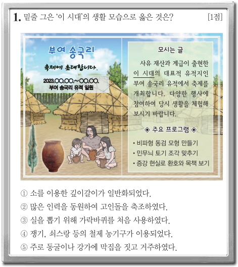 제시문에 사유재산과 계급이 출현한 시대와 부여송국리 유적, 주요 프로그램에서 비파형 동검, 민무늬 토기조각,