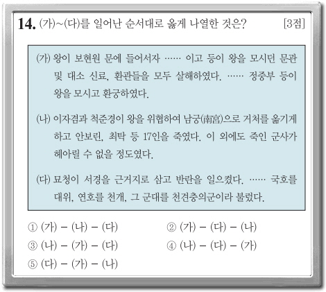 (가): 정중부 등이 왕을 모시고 환궁한 걸로 보아 무신정변입니다.