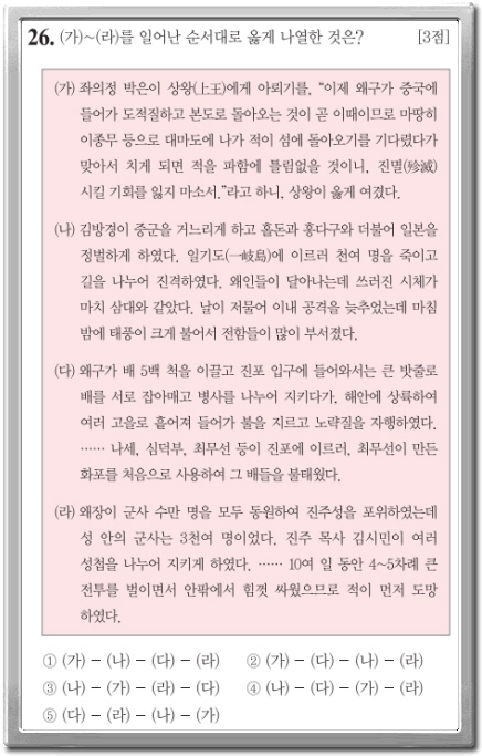 (라)는 진주 목사 김시민이 왜와 맞서 싸운 진주성 전투는 조선 선조 임진왜란 때입니다.
