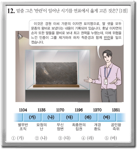 말풍선에 경원 이씨 가문 이자연, 문종의 왕비, 척준경을 언급한것으로 보아 고려때 발생한 이자겸의 난임을 알 수 있습니다.