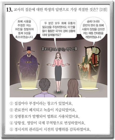 두 인물은 고려때 화폐 유통을 주장했습니다. 고려 때의 경제상황인 보기를 고르면 됩니다.