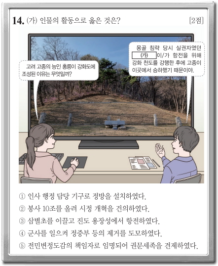 이 시기는 무신정권입니다. 무신 정권 중 최충헌의 아들인 최우 시기를 고르면 됩니다.